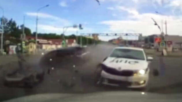 На видео попал момент жесткой аварии со служебной машиной ДПС в Приморье