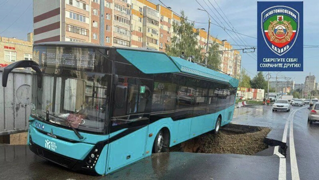 В Казани на фоне сильных ливней произошел провал асфальта под троллейбусом. Пассажиров эвакуировали, никто из них не пострадал, пишет «Россия-1».