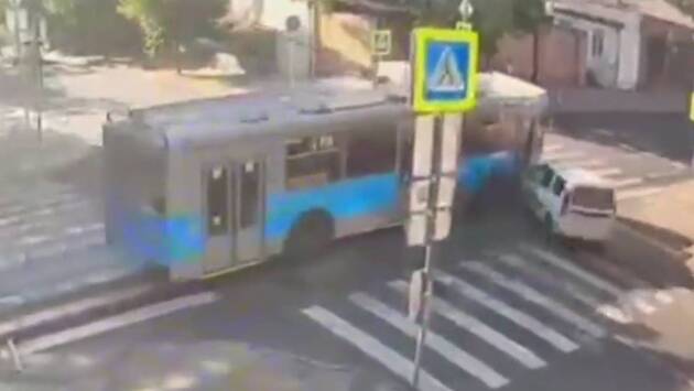 Троллейбус въехал в легковой автомобиль в российском городе, вызвал пожар и попал на видео
