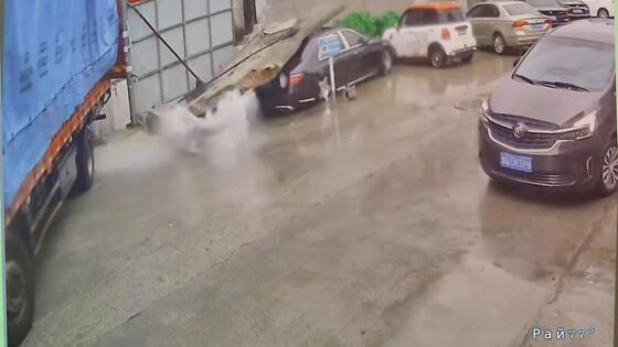 Камера наружного наблюдения запечатлела крайне неудачный заезд большегруза на территорию стоянки, находящейсяв населённом пункте Хаймень (городской округ Наньтун, провинция Цзянсу КНР).
