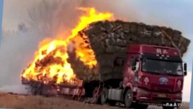 Со слов очевидца и автора видео, переданного Рай77°, проследившего за экстремальным перемещением грузовика, работник сенозаготовительной фермы имел неосторожность закурить за рулём и выкинуть непотушенный бычок из бокового окна транспортного средства.