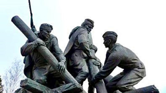 23 апреля 1942 года на этом месте семеро дорожников вели ремонт моста, когда внезапно появился враг. Отложив инструменты, они взяли оружие и приняли неравный бой. Все они погибли, но выиграли драгоценные часы для перегруппировки советских войск. Эта трасса тогда была главной артерией, питавшей Западный фронт и оборону Москвы.