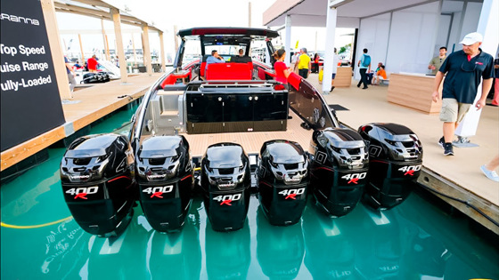 Почему у водяного монстра именно шесть моторов? Очевидно, потому что седьмой агрегат не поместился. На выставке Miami International Boat Show американская компания Cigarette показала невероятный Tirranna. Он роскошный, его внешность является удивительным симбиозом брутальности и грации. Но, пожалуй, наиболее интересный, запоминающийся и примечательный факт, связанный с Cigarette Tirranna – это шесть рядных шестицилиндровых двигателей Mercury Racing Verado 400R объемом 2,6 л, являющиеся одними из мощнейших серийных подвесных моторов за всю историю компанию Mercury. Каждый такой агрегат развивает 400 л.с. и демонстрирует едва ли не лучшее соотношение мощности и массы среди всех четырехтактных подвесных двигателей в своем классе. При полной массе, превышающей 18 тонн, лодка способна выжимать свыше 115 км/ч. Запас топлива на борту – 3785 л. Видео: Alfred Montaner