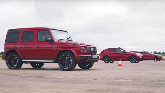 YouTube-канал carwow показал тройную гонку между немецким, английским и итальянским кроссоверами. Эксперты сравнили динамику полноприводных автомобилей повышенной проходимости при старте с места и с хода, а также замерили эффективность тормозов. Три вседорожника представляют ведущие автомобильные школы Старого Света. Британский Jaguar F-Pace SVR оснащается 5,0-литровым компрессорным V8 мощностью 550 лошадиных сил (680 Нм крутящего момента) и весит 1775 килограммов. Легендарный Mercedes-AMG G 63 из Германии приводит в движение 4,0-литровый V8 с двойным наддувом мощностью 585 лошадиных сил и крутящим моментом 850 Нм. «Гелендваген» намного тяжелее конкурентов: снаряжённая масса достигает 2485 килограммов. Самый лёгкий и маломощный — Alfa Romeo Stelvio Quadrifoglio Verde с 2,9-литровым V6 Biturbo. Итальянский кроссовер развивает 510 сил (600 Нм крутящего момента), но весит Alfa Romeo на 115 килограммов меньше «Ягуара». Трём рубиновым внедорожникам потребовалось два старта с места и фотофиниш, чтобы выявить победителя: четверть мили конкуренты прошли с одинаковым с точностью до десятой временем 12,0. Аутсайдер уступил 0,3 секунды: В заездах с хода со скорости в 80,5 километров в час (50 миль в час) решающую роль сыграли подрулевые лепестки, а экстремальное торможение со скорости в 113 километров в час (70 миль в час) удивило неожиданным раскладом. Некоторые зрители остались недовольны форматом замера тормозного пути: по мнению подписчиков, при торможении с высоких скоростей ключевую роль играет реакция водителя, а не технические характеристики испытуемых машин. Впрочем, блогеры канала carwow снимают шоу, не претендуя на абсолютную истину. Источник: carwow, YouTube-канал