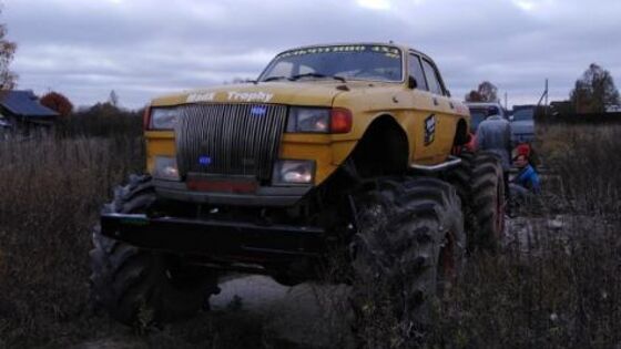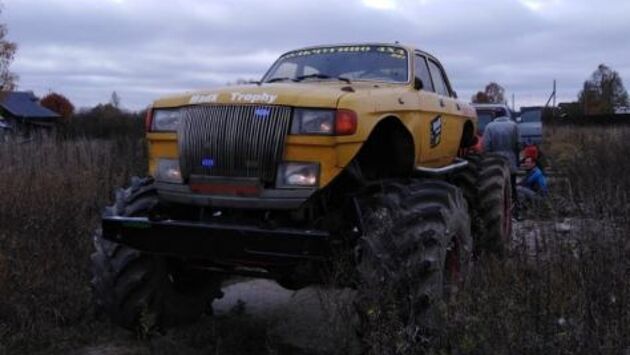 Глядя на дорожного «монстра», созданного на базе ГАЗ-310ГАЗ-3102929, невольно возникает мысль, не снесет ли он дорожные знаки? Для создания монструозного гибрида была взята рама от ГАЗ-66, кузов от «Волги» поставили на четыре опоры, две из которых центральные, кузов закреплен на подвижные крепления. Раздаточная коробка была взята от «Урала», огромные колеса позаимствовали у сельхозтехники, от экскаватора взяли гидравлическую рулевую систему. Удлинили моторный отсек на 20 см. Под капотом у монструозной «Волги» 150-сильный двигатель объемом 11 литров. Тормозную систему позаимствовали у «Шишиги», от «Урала» - гидравлический пневмоусилитель. Недостатком гибрида является плохая видимость от 5 до 10 метров перед капотом. Это ведет к созданию опасной ситуации на дороге. Кроме того, поездка по бездорожью в плохую погоду приведет к заляпыванию грязью стекол вездехода, с чем дворники не справляются. Необходим хороший насос на бачок омывателя, чтобы сбивать грязь с лобового стекла.