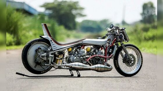 В Индонезии собрали мотоцикл Ninja 150 RR с двумя силовыми агрегатами. В данной модели переделали зажигание, расточили каналы. Модель похвастается 270-градусными гоночными коленвалами, облегчённым маховиком и квикшифтером, особенным карбюратором. Для длинных выхлопных труб и резонаторных камер использовалась нержавейка. В драг-мотоцикле мастера убрали всё, кроме двигателя. Потом специалисты установили новую раму, используя алюминиевую трубу. При этом применялся стапель под кастомные рамы. Модель должна быть очень лёгкой, чтобы обеспечивалось наилучшее соотношение мощности, а также массы. Длина мотоцикла между осями колёс составляет 1,68 м. Его построили в олдскульном стиле. Верхняя травеса была взята у Suzuki RGR 150. Вилку от Kawasaki укоротили на 10 см. Для 17-дюймовых колёс обувкой послужили Goodyear Eagle. Заднее колесо получило алюминиевую сплошную заглушку. На голом руле размещается тахометр, вольтметр и термометр. Обвес вручную выполнили единым куском из брашированного алюминия. Модель получила длинную резиновую подушку условно комфортного сиденья. Она позволяет свободно менять посадку.