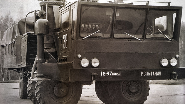 В глубине бортового кузова скрывалась «восьмерка» ЗИЛ-375, не имевшая физической связи с колесами и приводившая 120-киловаттный генератор постоянного тока для мотор-колес. Второй агрегат V8 приводил задние колеса на пересеченной местности и в нештатных ситуациях. Диковинная колесная формула 4х4+2х2 как она есть во всей своей инженерной красе! Прототип хорошо показал себя на испытаниях, но дальше них дело не пошло — не стало Королева, а Василий Павлович Мишин, сменивший его на посту главного конструктора ракетно-космических систем, выступил против подобного способа транспортировки.
