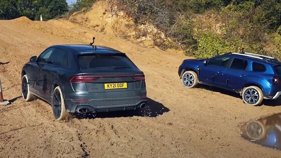 На канале Carwow сравнили внедорожные возможности бюджетного Dacia Duster и Audi RS Q7, оснащённого V8 мощностью 600 л.с.