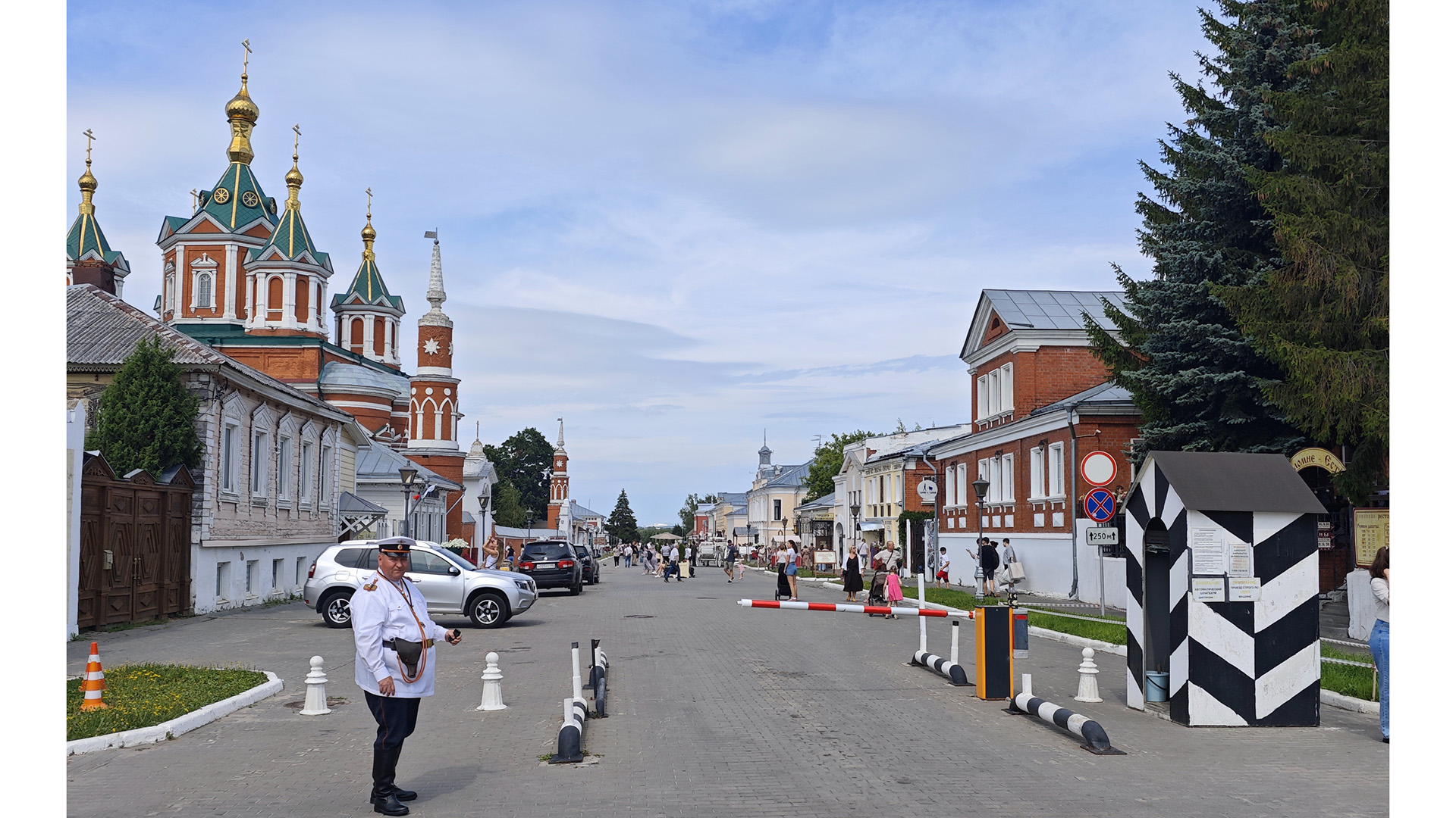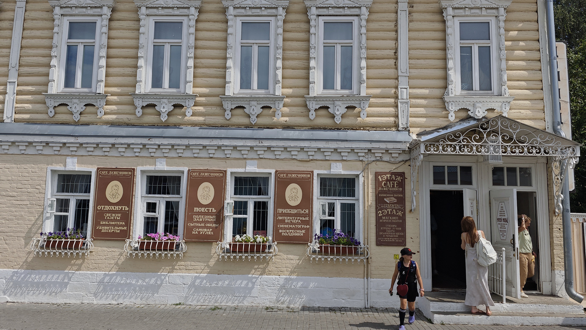 А вот следующая улица — Лажечникова — оказалась полной противоположностью тишине Соборной площади. Это место, явно ориентированное на туристов, но сделанное с известной долей вкуса. Отреставрированные двухэтажные купеческие особняки, брусчатка, конные экипажи… Атмосфера здесь напоминает декорации к историческому фильму: всё достаточно аккуратно и нарядно.