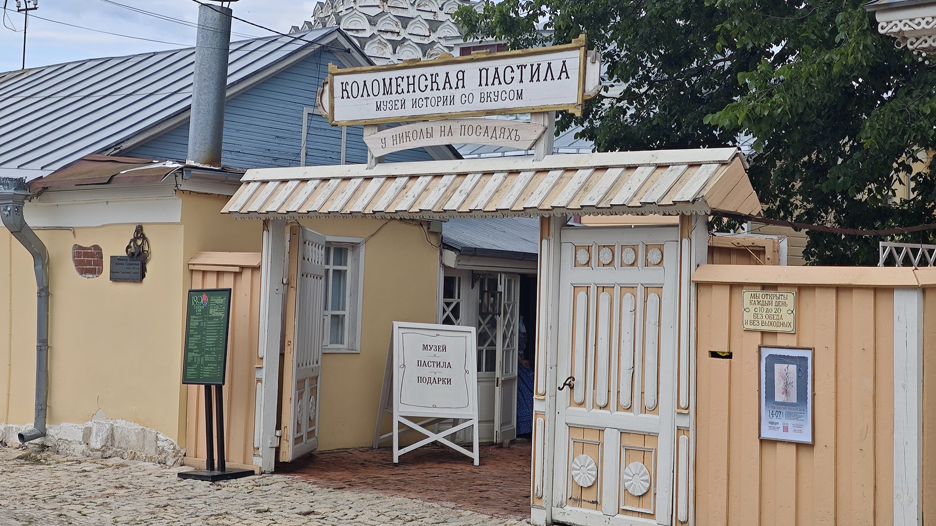 Спустившись с небес, мы отправились на улицу Посадскую, царство ароматов яблок, мёда и корицы — в Музей Коломенской пастилы. Это не просто музей, а настоящее театрализованное действо. Нам повезло попасть на экскурсию (стоимость билета 950 рублей). Хозяйка в старинном платье рассказала и показала, как готовили пастилу по рецептам XIX века.