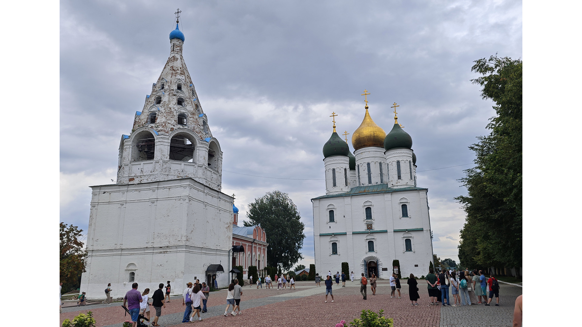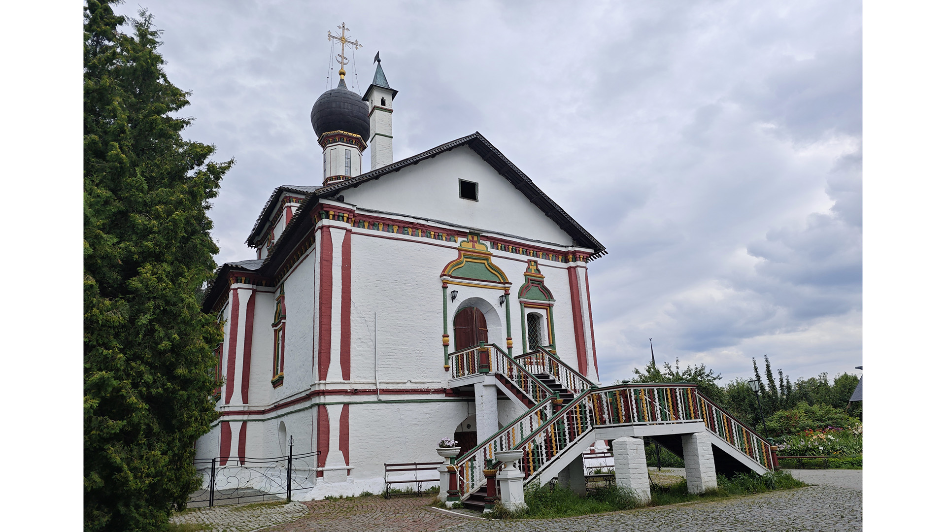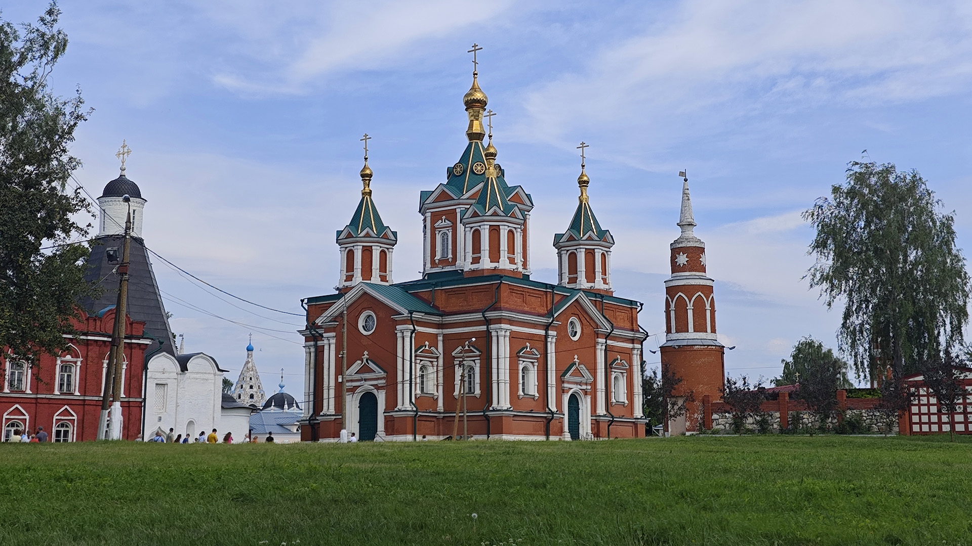 Его монументальный красно-белый облик с пятью тёмными куполами создаёт удивительный контраст с древними крепостными стенами и изящной шатровой Успенской церковью, расположенной по соседству.